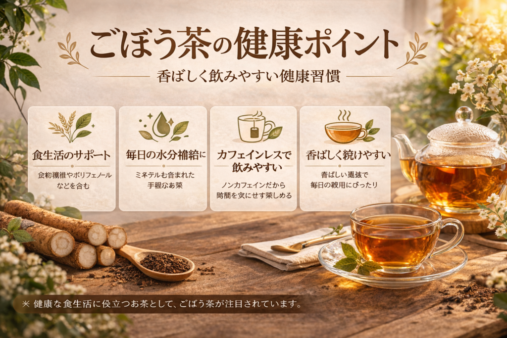 このように、ごぼう茶は毎日の生活に無理なく取り入れやすく、健康を意識した習慣づくりに役立つお茶といえます。