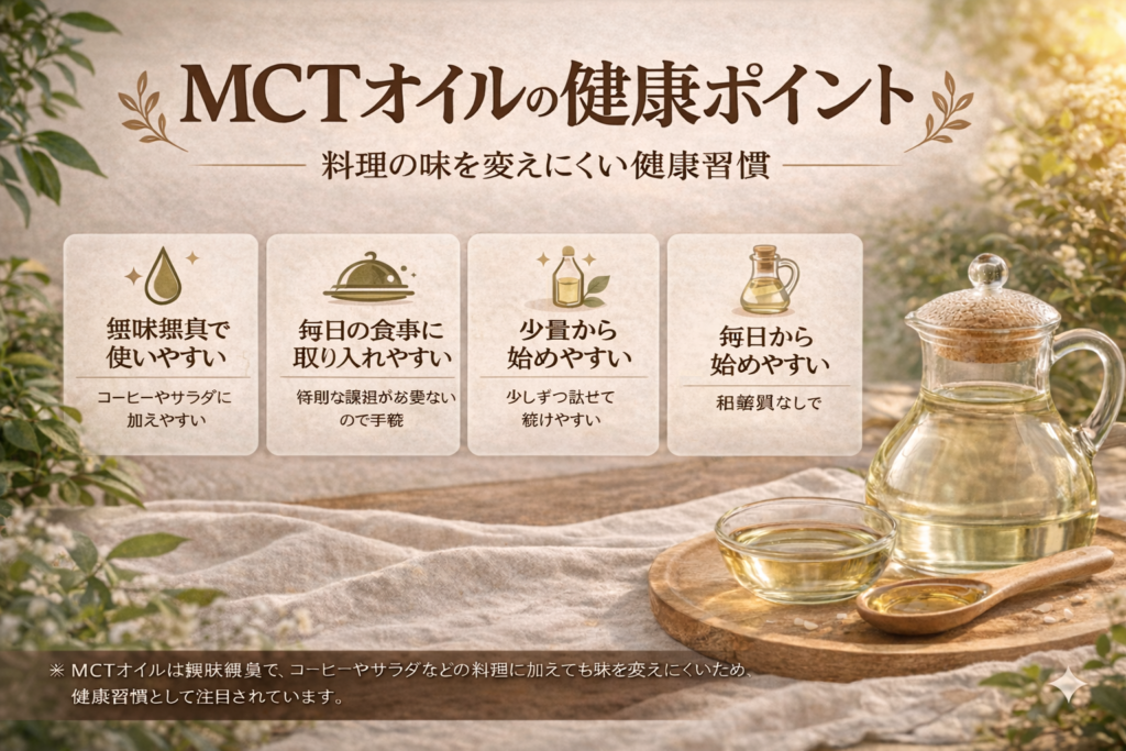 コーヒーやヨーグルト、サラダなど、日常の食事に取り入れやすいMCTオイルを選ぶことで、無理なく健康習慣として続けやすくなります。