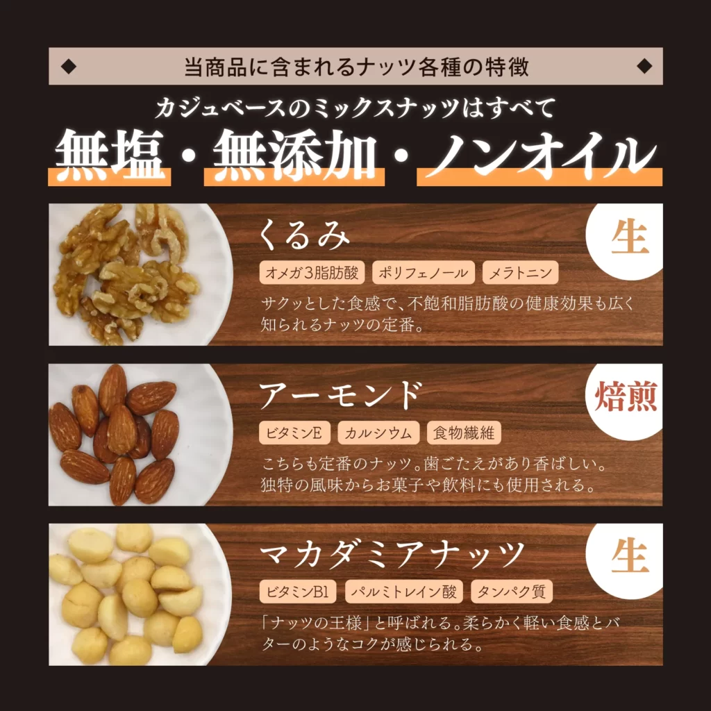 素焼きアーモンド・くるみ・カシューナッツがバランスよく入っており、毎日少しずつ食べたい方にもおすすめです。