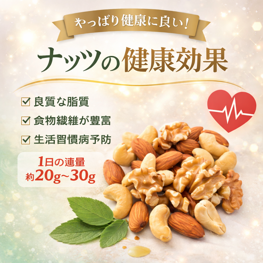などが確認されており、週に数回ナッツを摂取する人は、心臓病のリスクが 30〜50%低い という結果も報告されています。