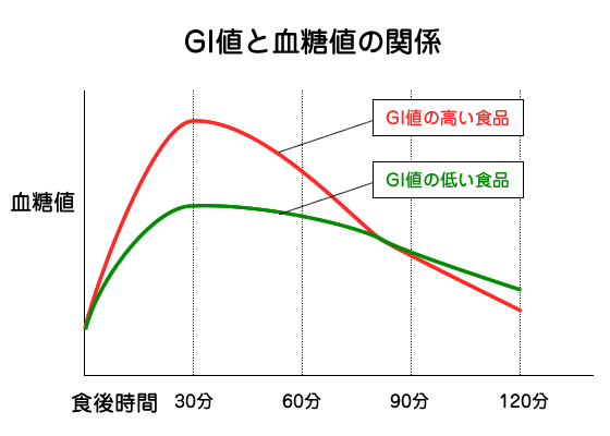 一方、GI値が低い食品は、血糖値の上昇がゆるやかになります。