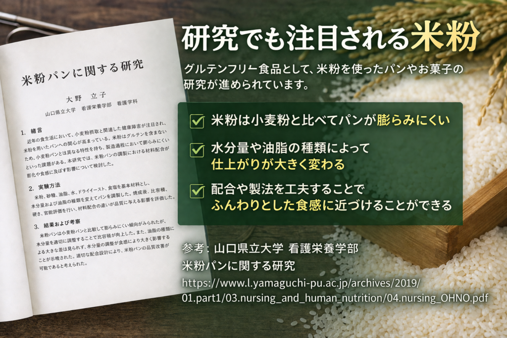研究では、米粉はグルテンを含まないため、小麦粉のパンと比べて膨らみにくい特徴があることが示されています。